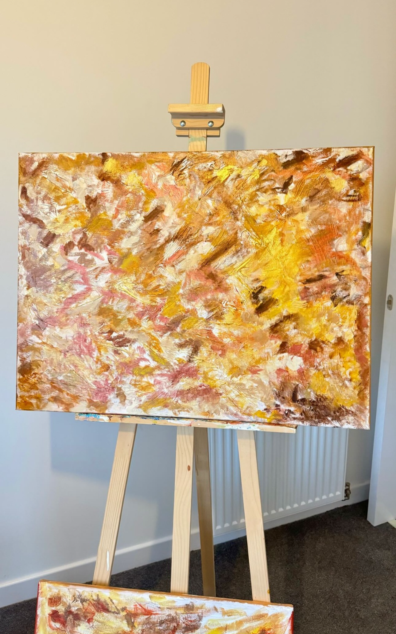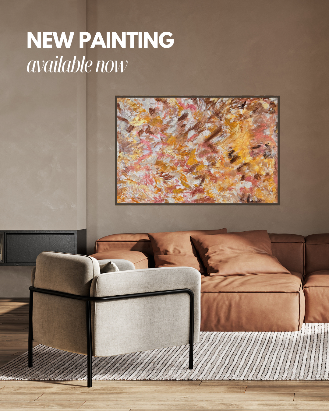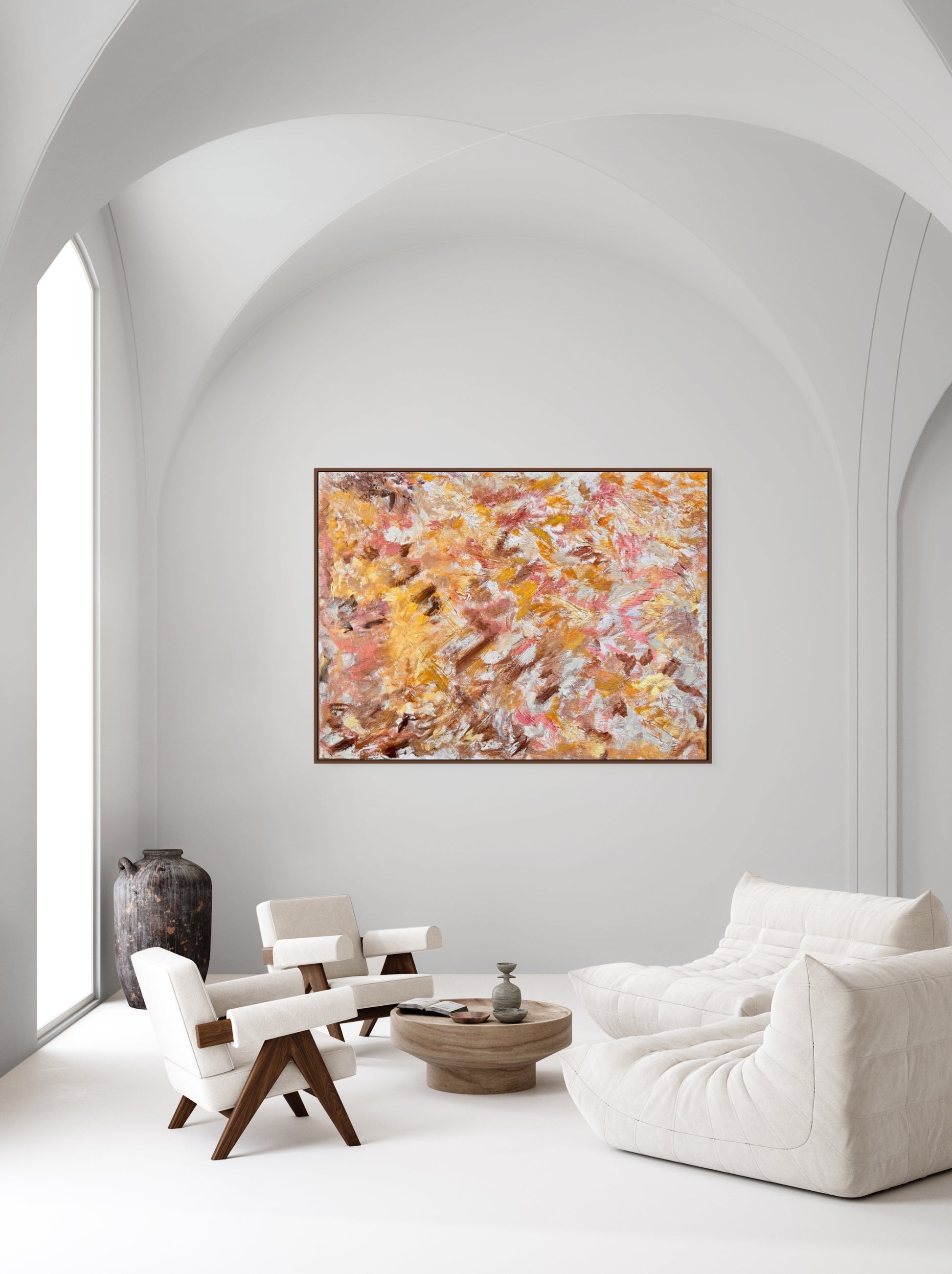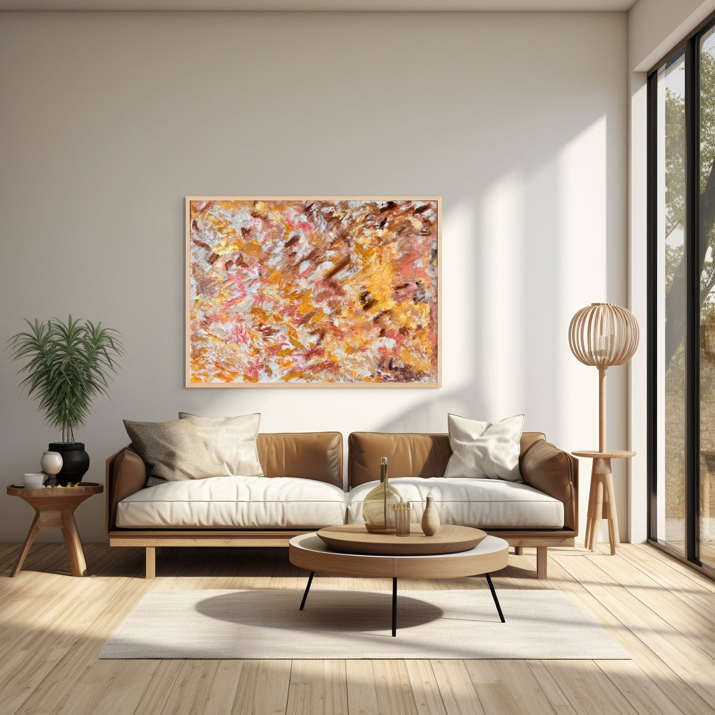 "Autumn's Embrace" captures the warmth and richness of the autumn season through a vibrant palette of golds, yellows, and earthy browns. The textured brushstrokes create a sense of movement, reminiscent of leaves gently falling to the ground on a crisp autumn day. This piece evokes the comforting and nostalgic feelings associated with autumn, making it a perfect addition to any space that seeks to celebrate the beauty of nature’s changing seasons.