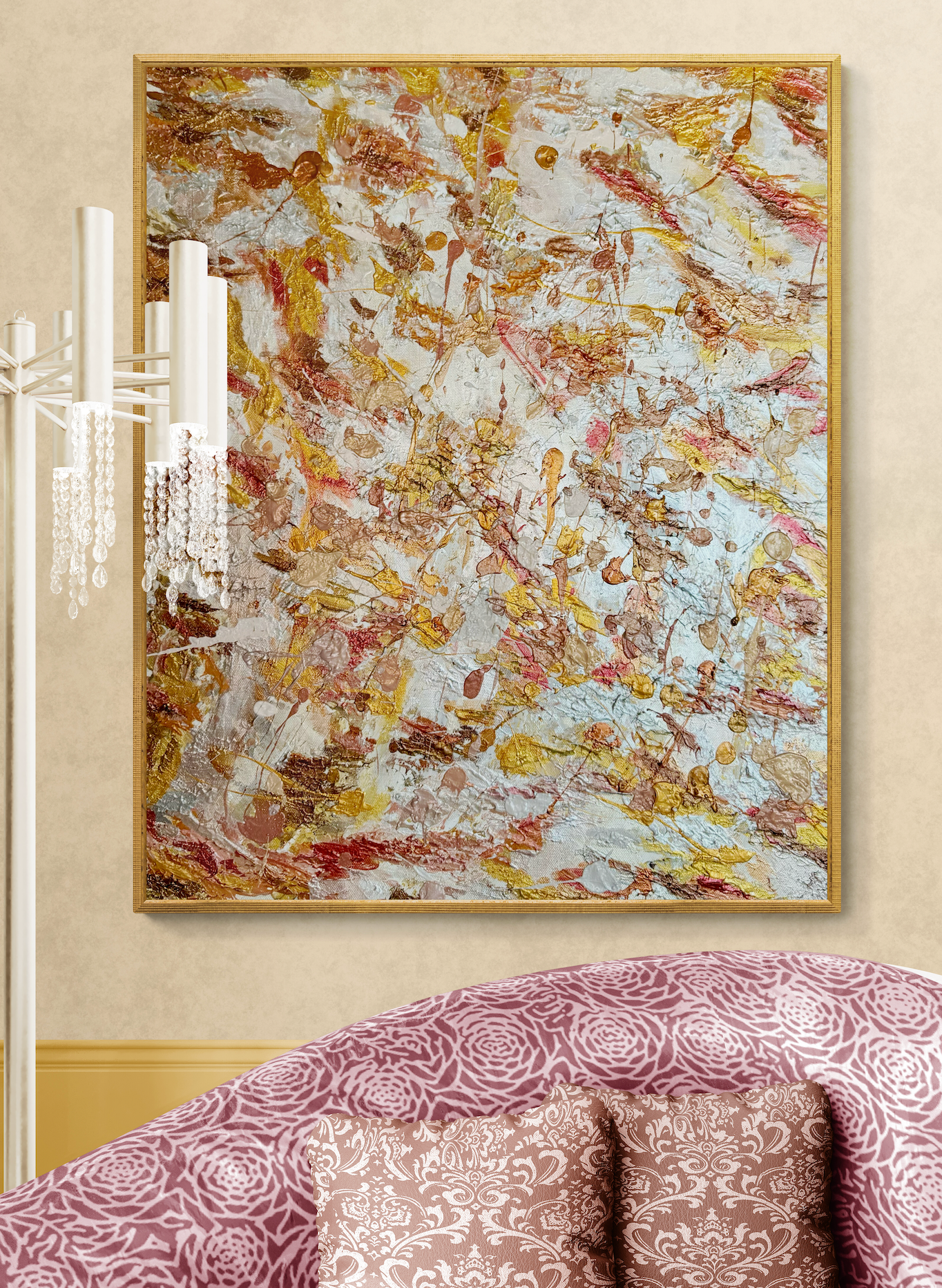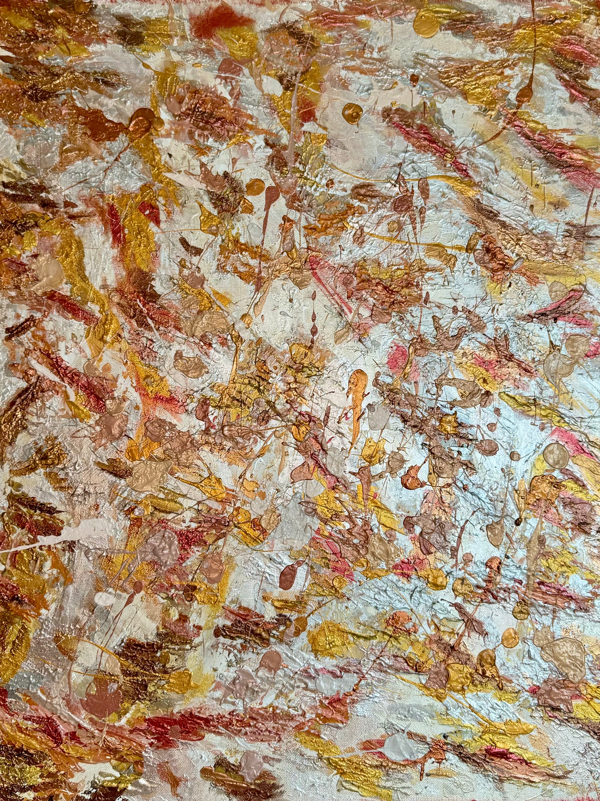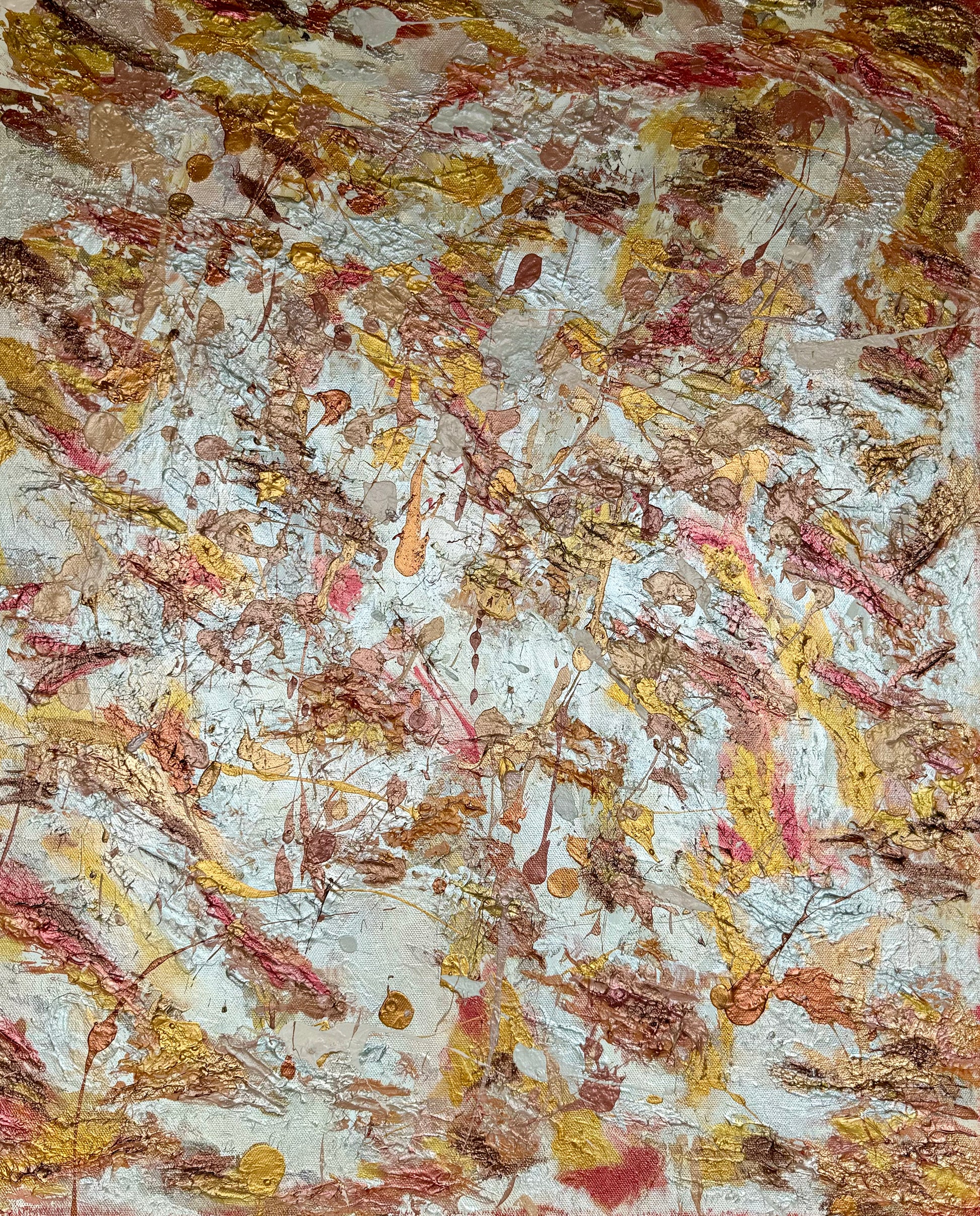A rich interplay of gold, bronze, and earthy crimson dances across a layered surface in Coalescence — a piece that captures the essence of transformation, unity, and emotion in motion.