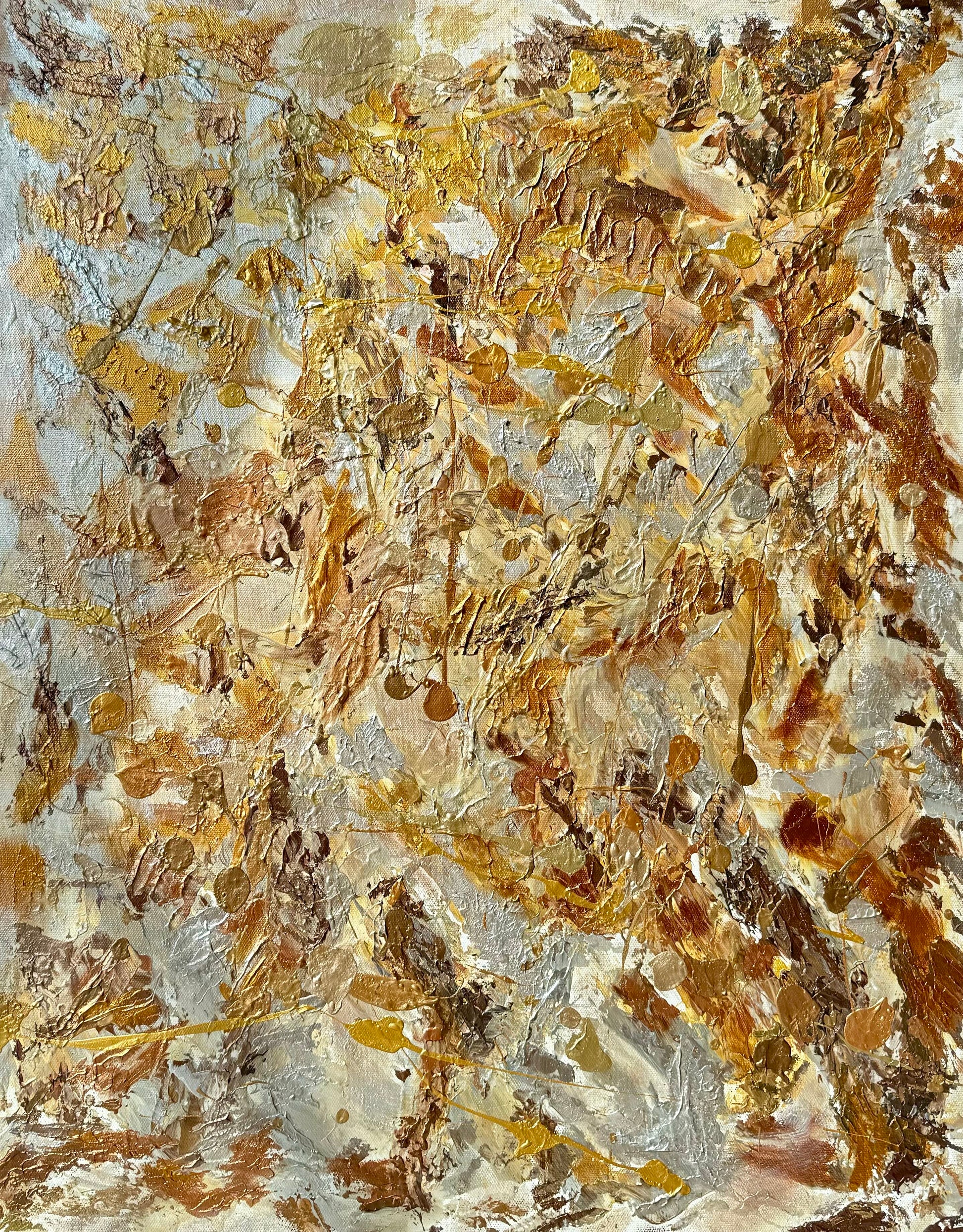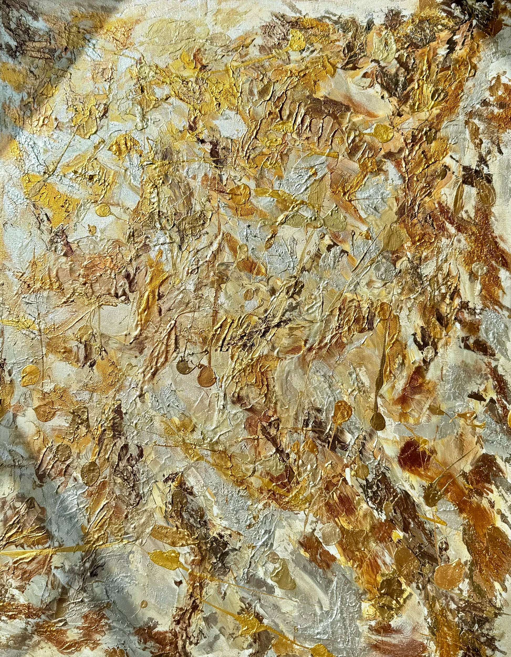 This painting was created with the idea of molten gold — droplets of warmth, light, and richness falling onto the canvas. Layers of gold, bronze, and soft beige build up into a textured surface that almost feels like it’s glowing. It’s meant to bring a sense of quiet luxury, like sunlight catching on jewellery or the shimmer of gilded edges.