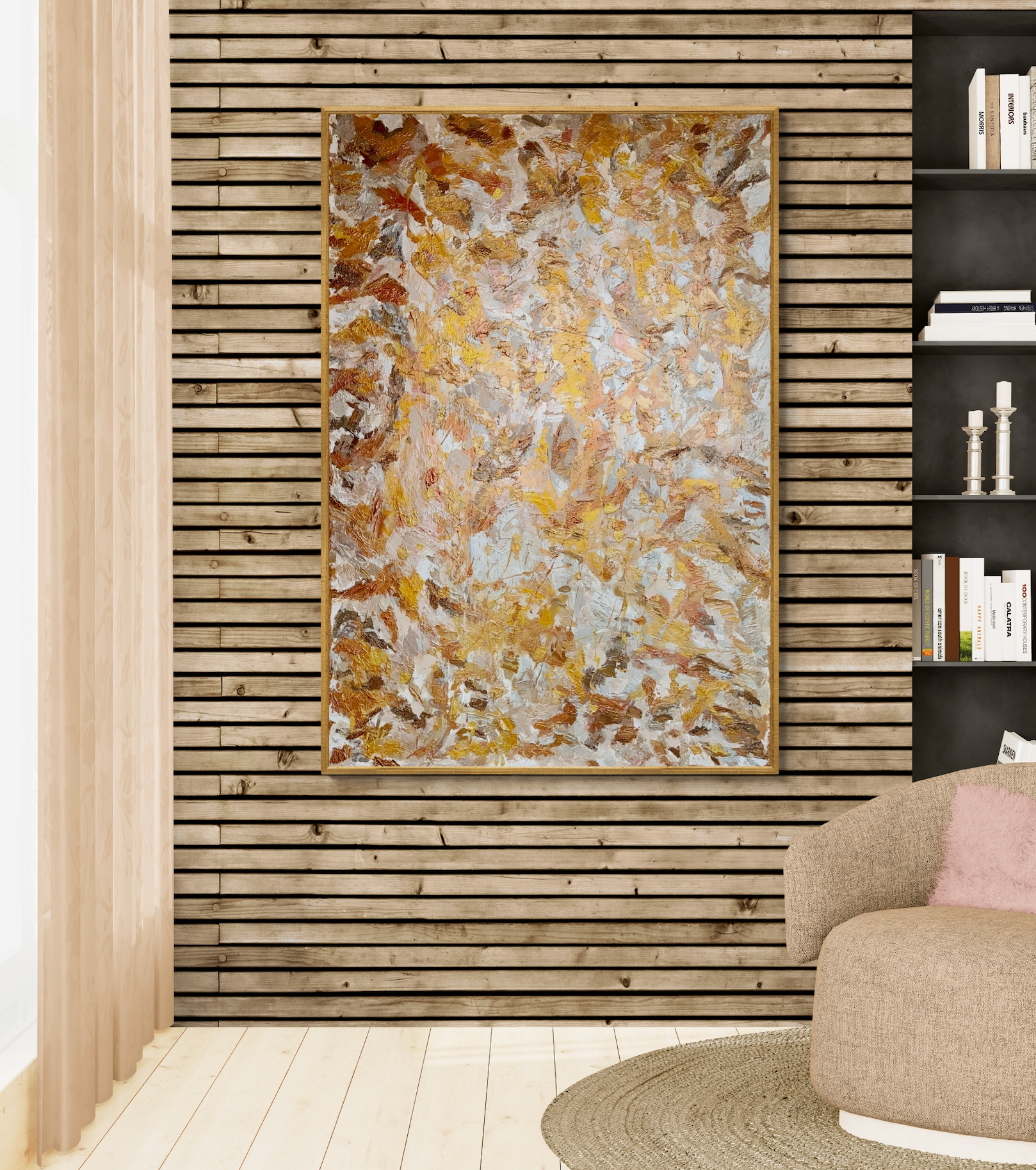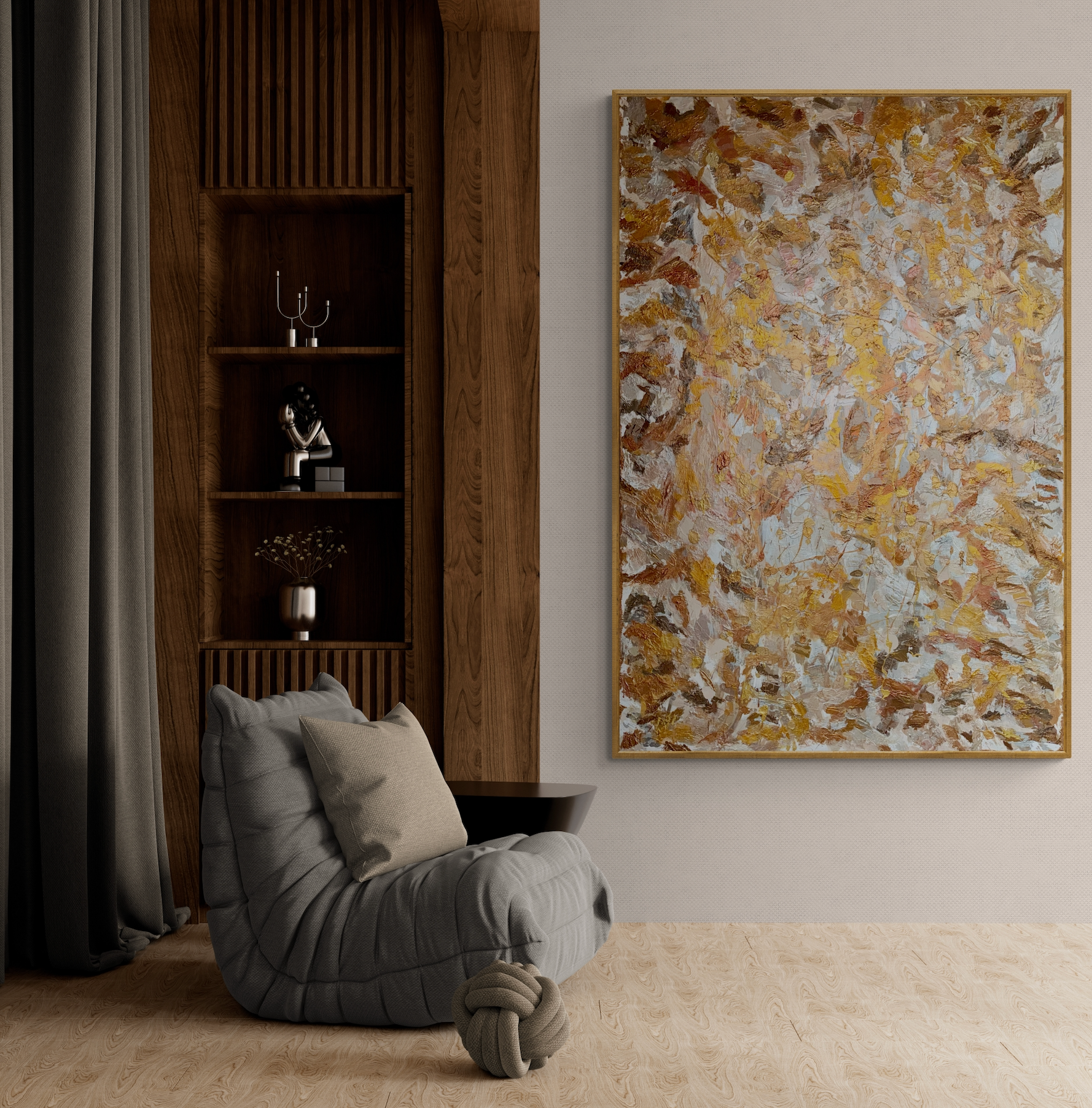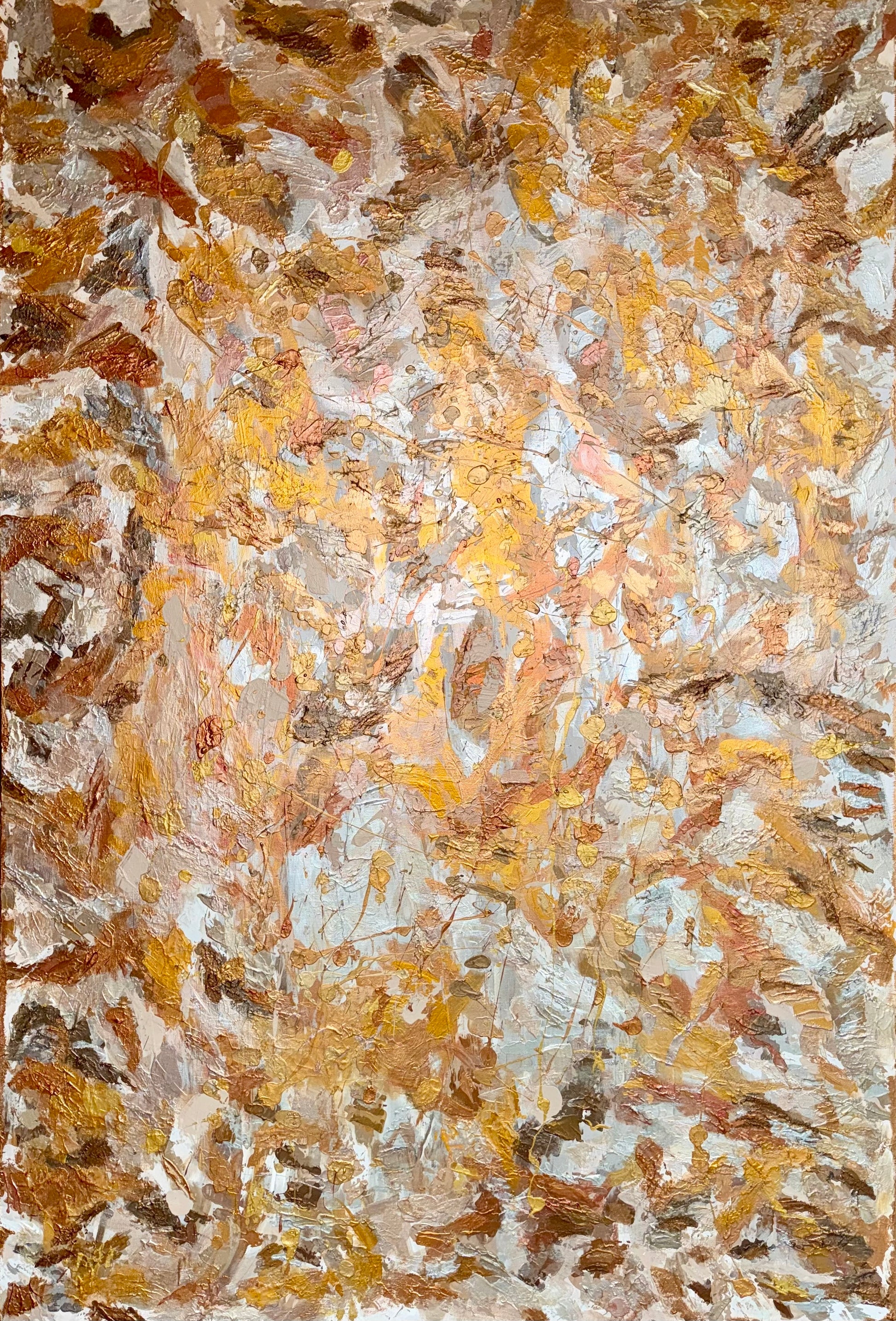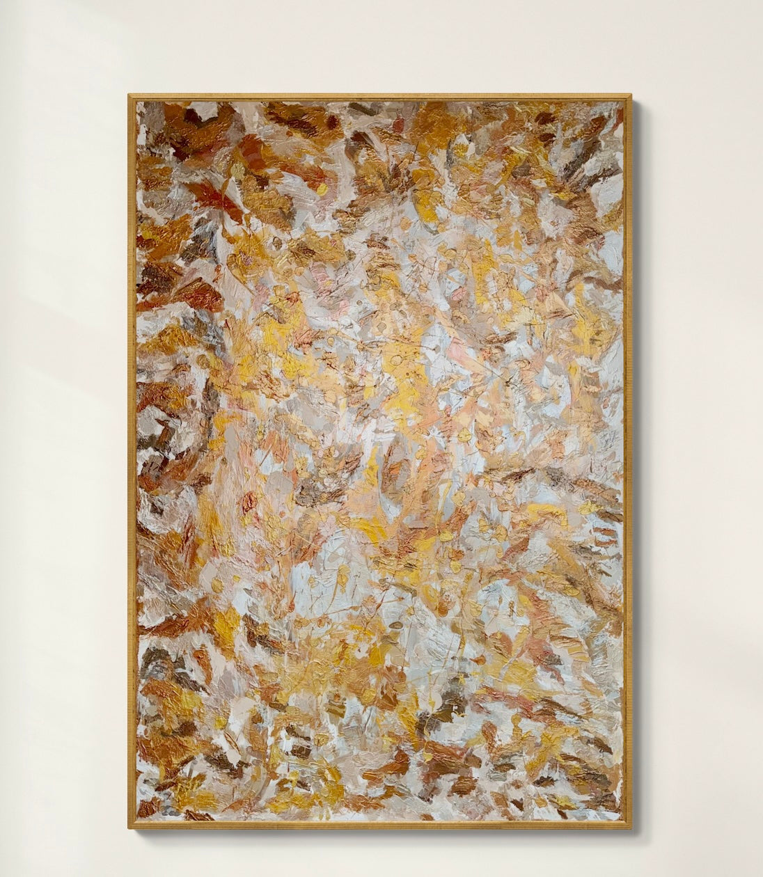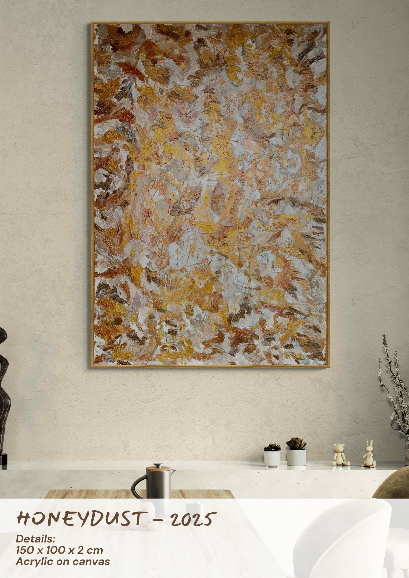 This piece feels like sunlight settling over everything — that soft golden hour where the world seems warmer and slower. I worked with layered strokes of ochre, bronze, and pale cream, almost like scattering honey across the canvas, letting it catch the light in different ways.
