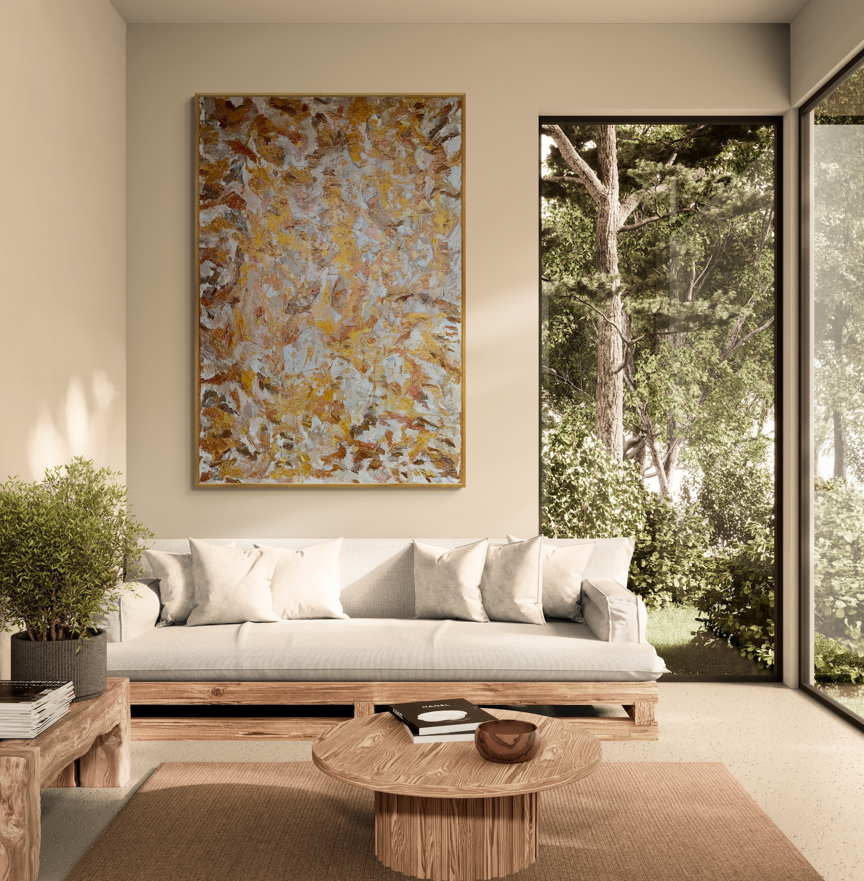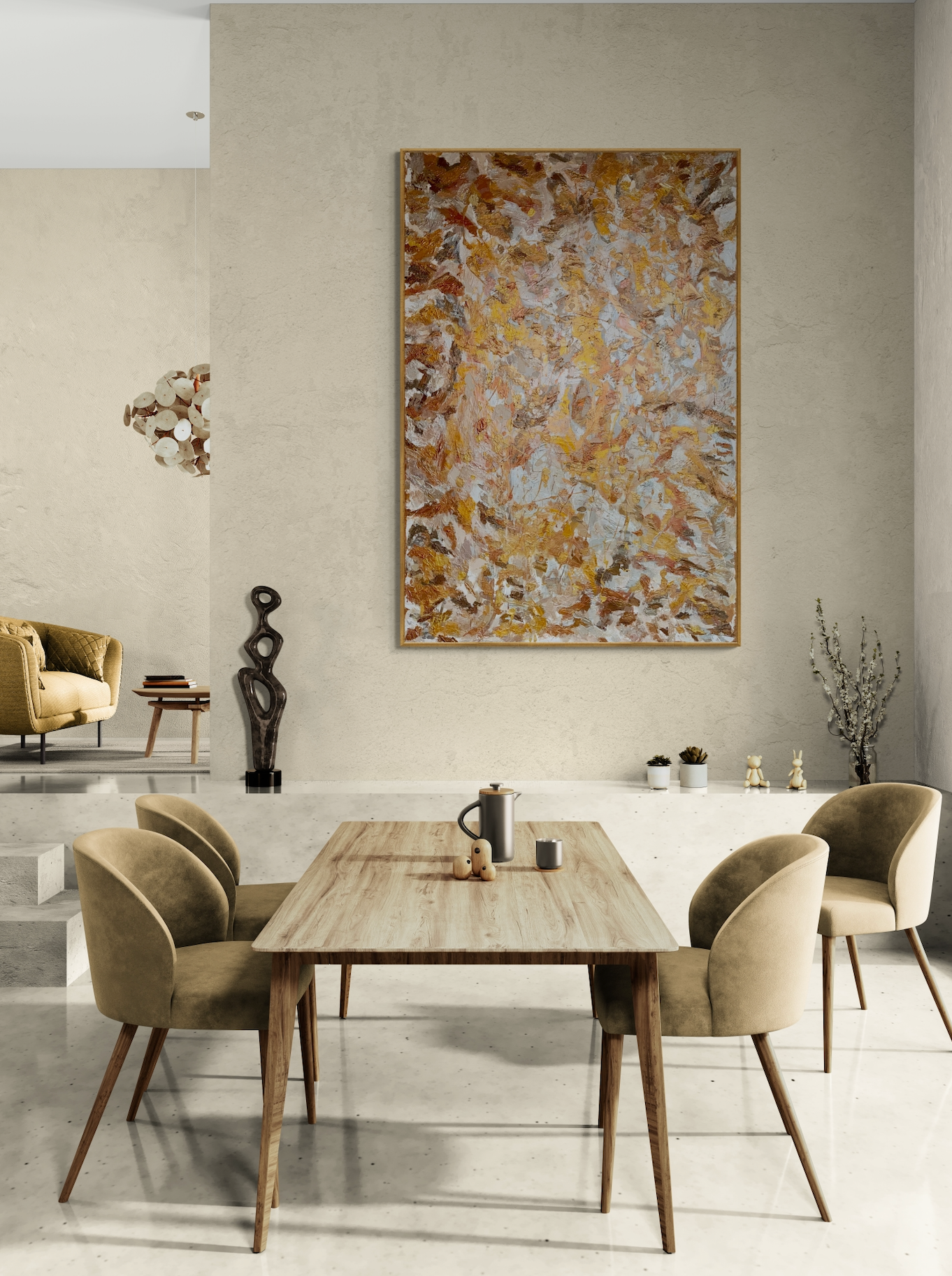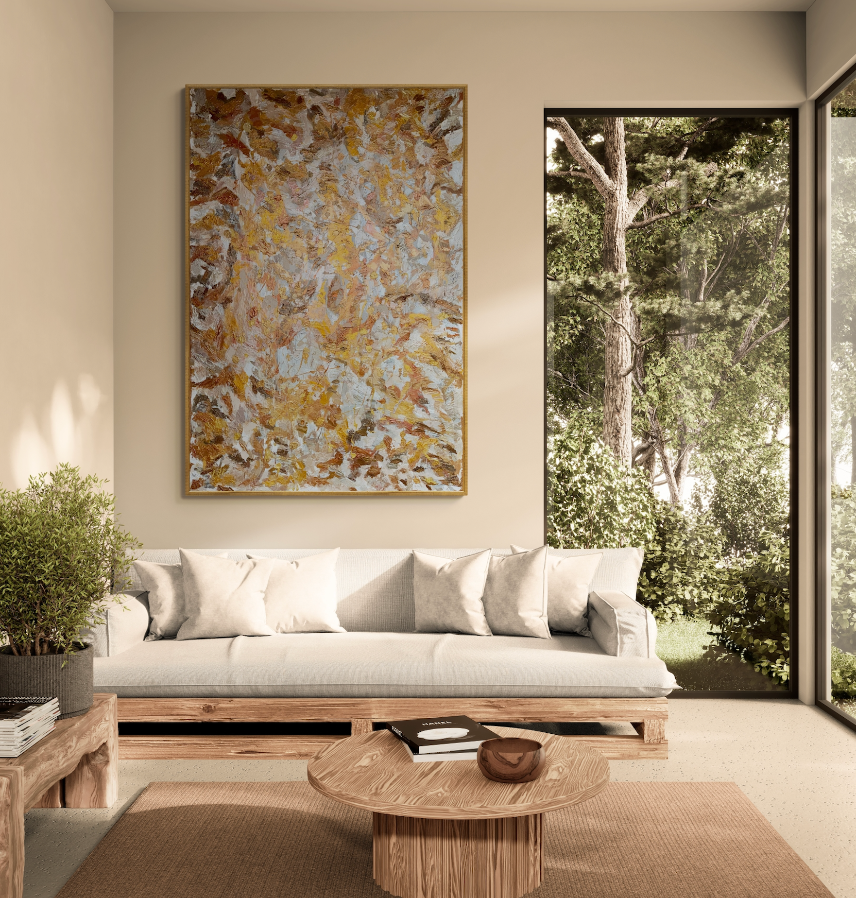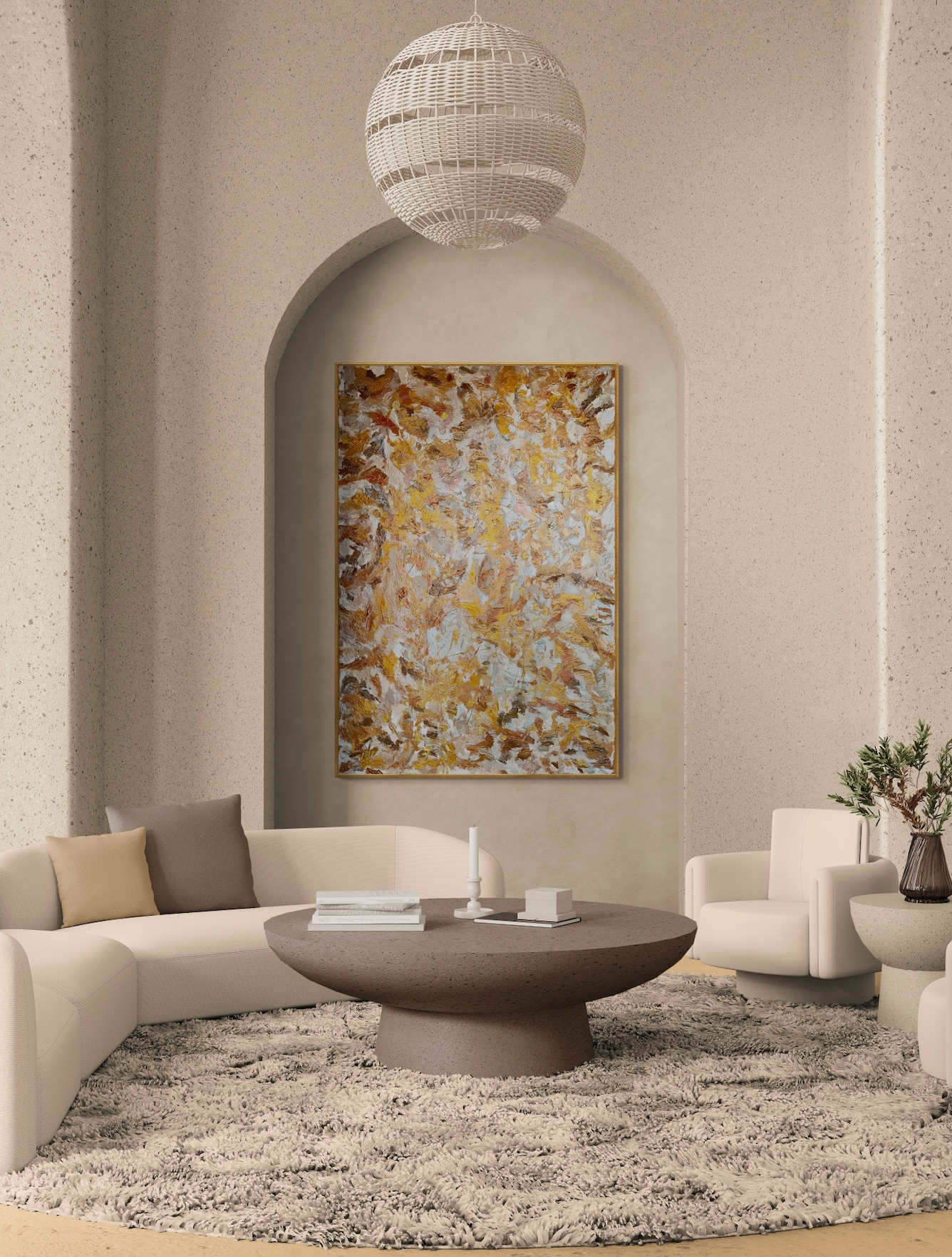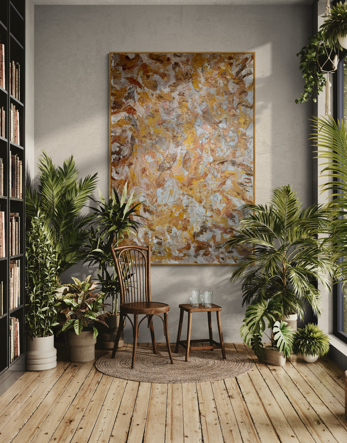 This piece feels like sunlight settling over everything — that soft golden hour where the world seems warmer and slower. I worked with layered strokes of ochre, bronze, and pale cream, almost like scattering honey across the canvas, letting it catch the light in different ways.
