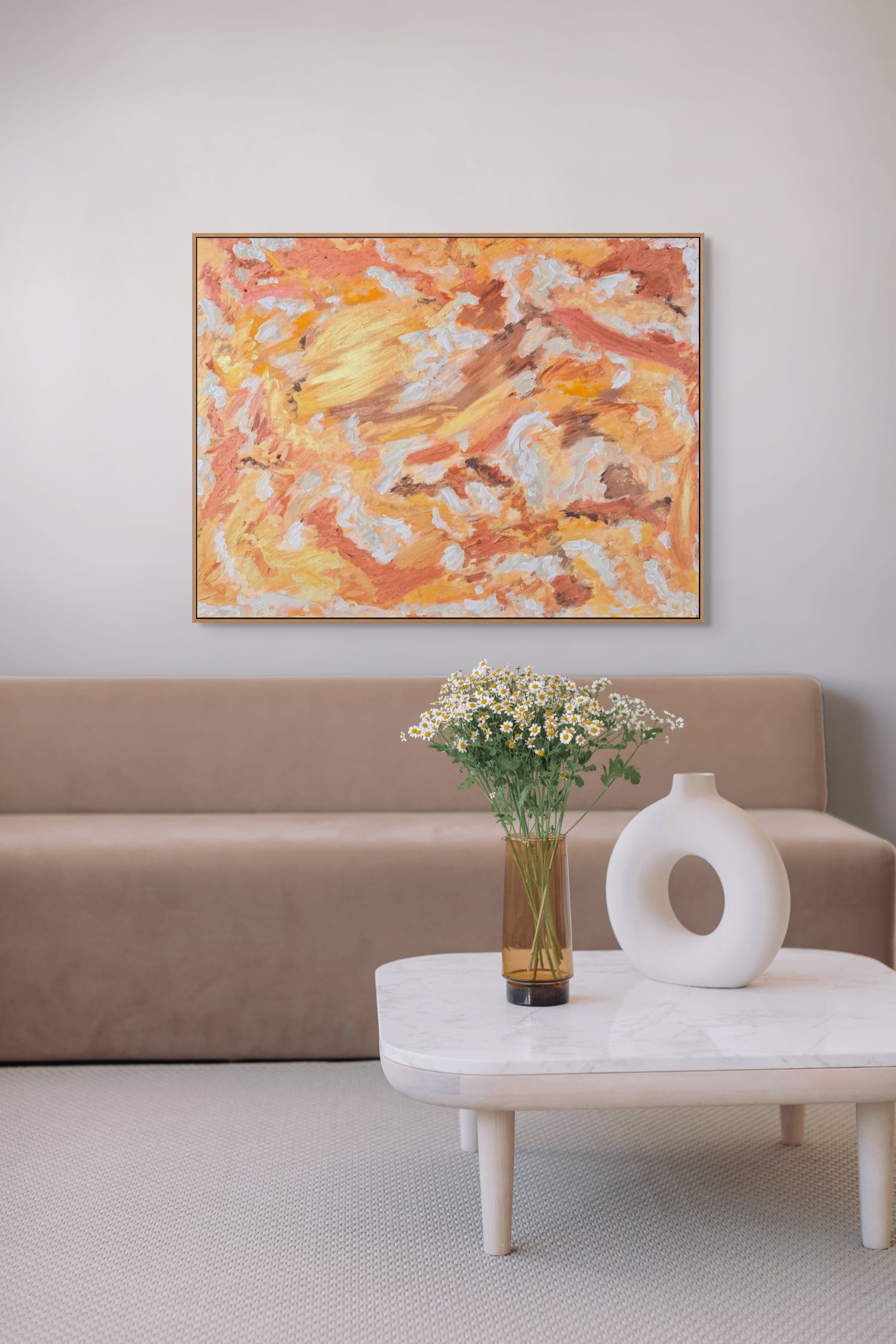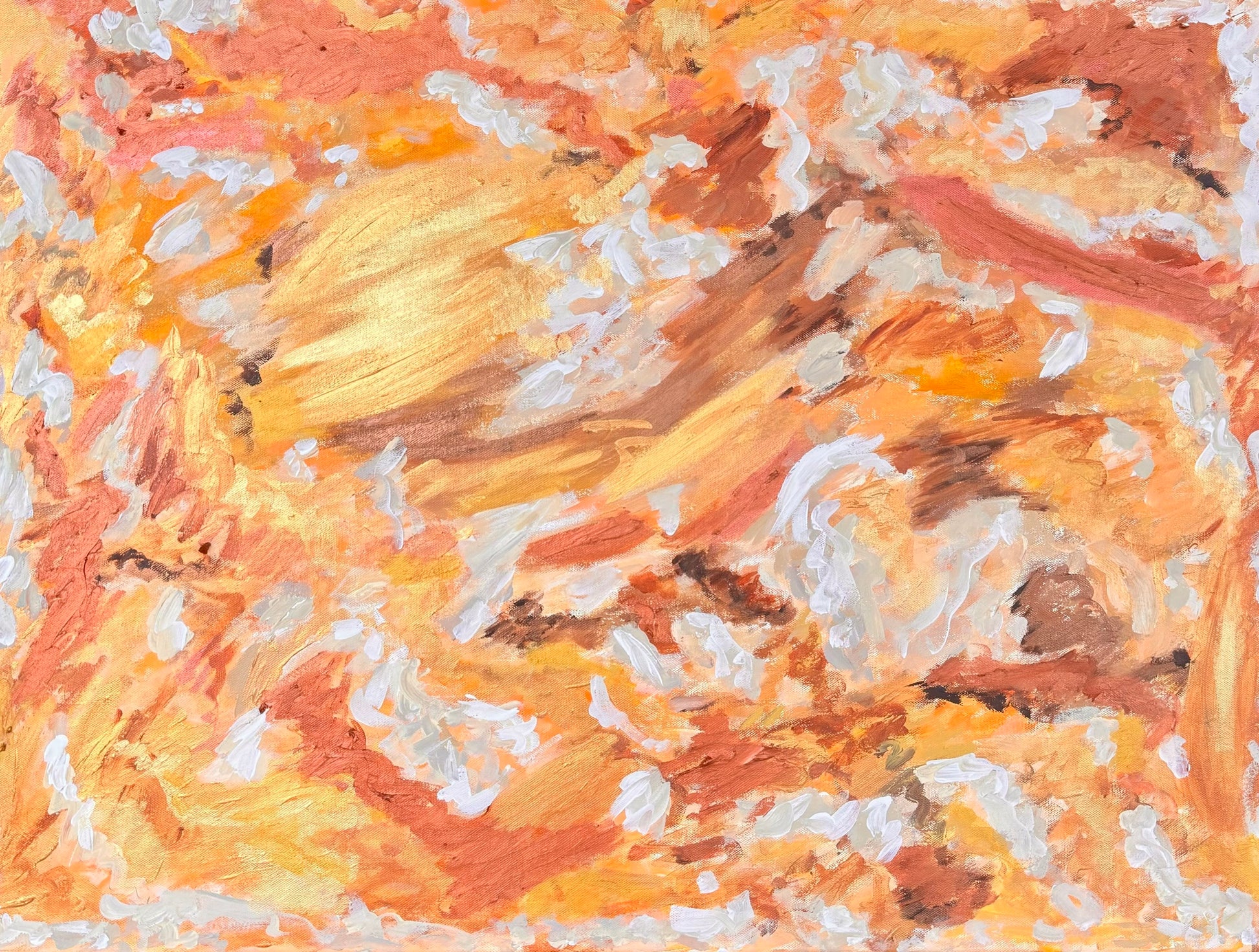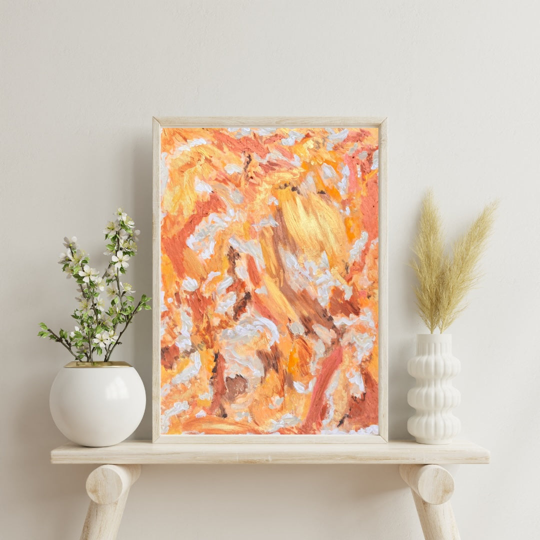 "Golden Hour Glow" captures the warmth and radiance of the moments just before sunset, where the world is bathed in soft, golden light. The vibrant tones of orange, gold, and white dance across the canvas in a harmonious blend, evoking the comforting and uplifting energy of a sunlit evening. The textured brushstrokes add depth and movement, making this piece feel alive with the warmth of the golden hour. Perfect for bringing a touch of natural light and warmth into any space, this painting is a celebration of the beauty found in nature's most fleeting moments.