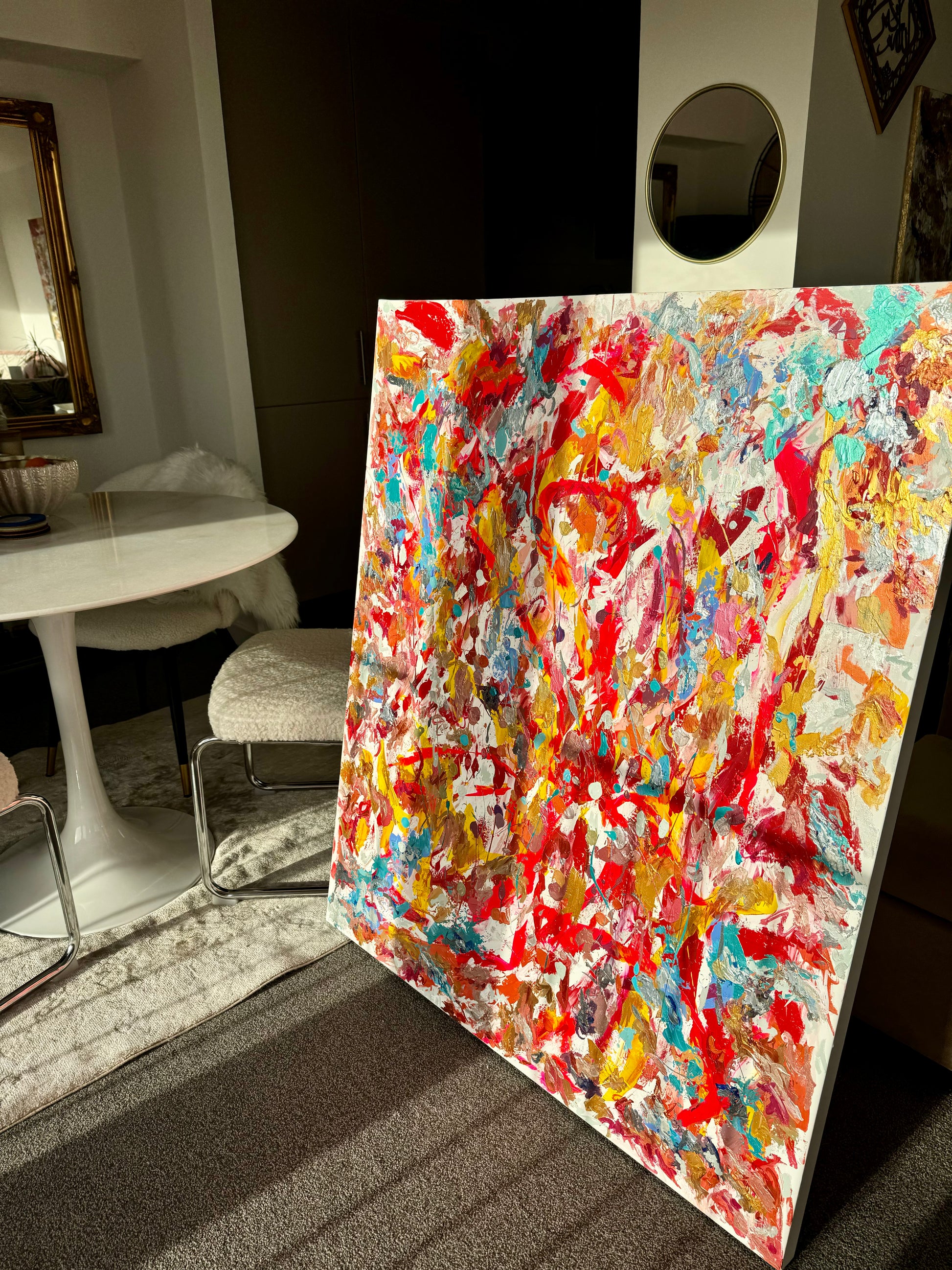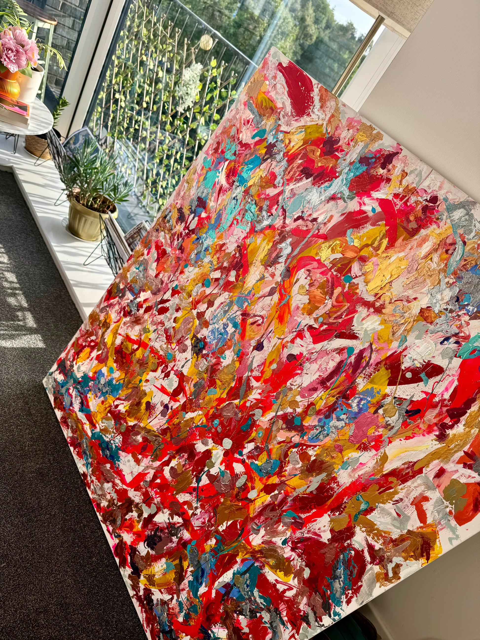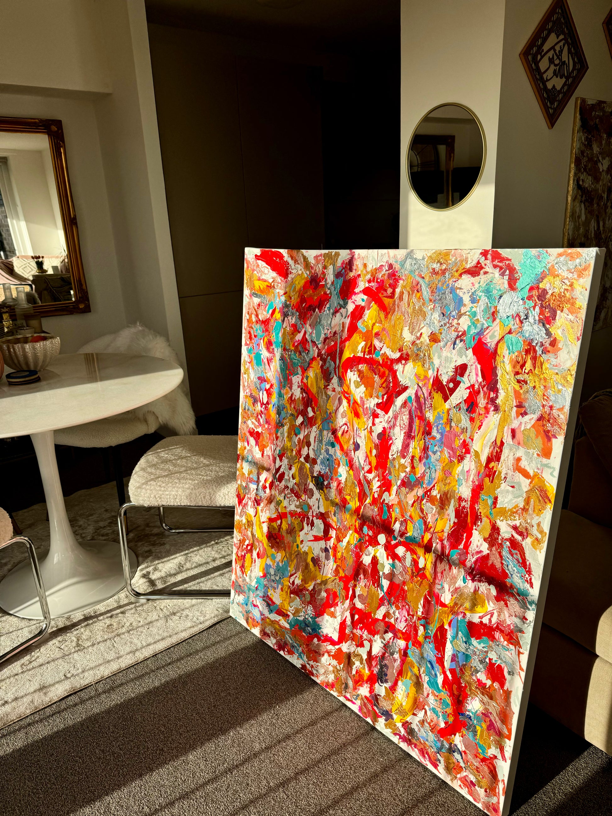Mirage glistens with contrast and energy — a painting alive with shifting tones of crimson, gold, and turquoise. In the glow of the golden hour, its surface comes to life, radiating warmth and depth, pulling the viewer into its layered textures and changing light.