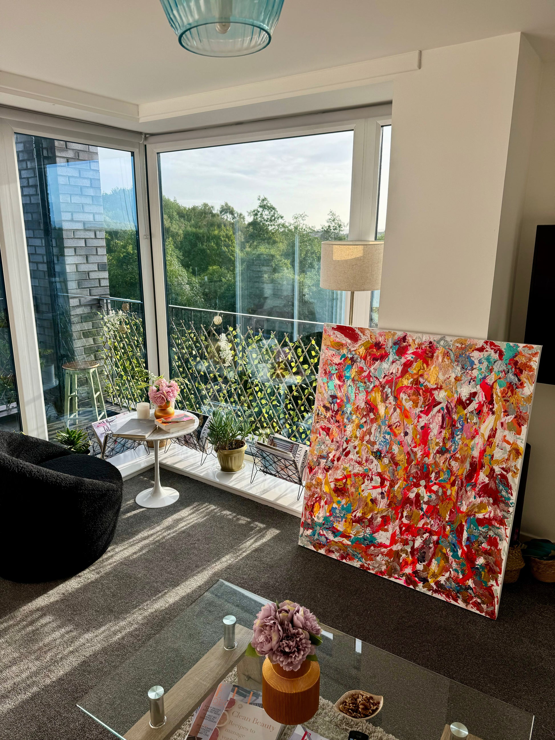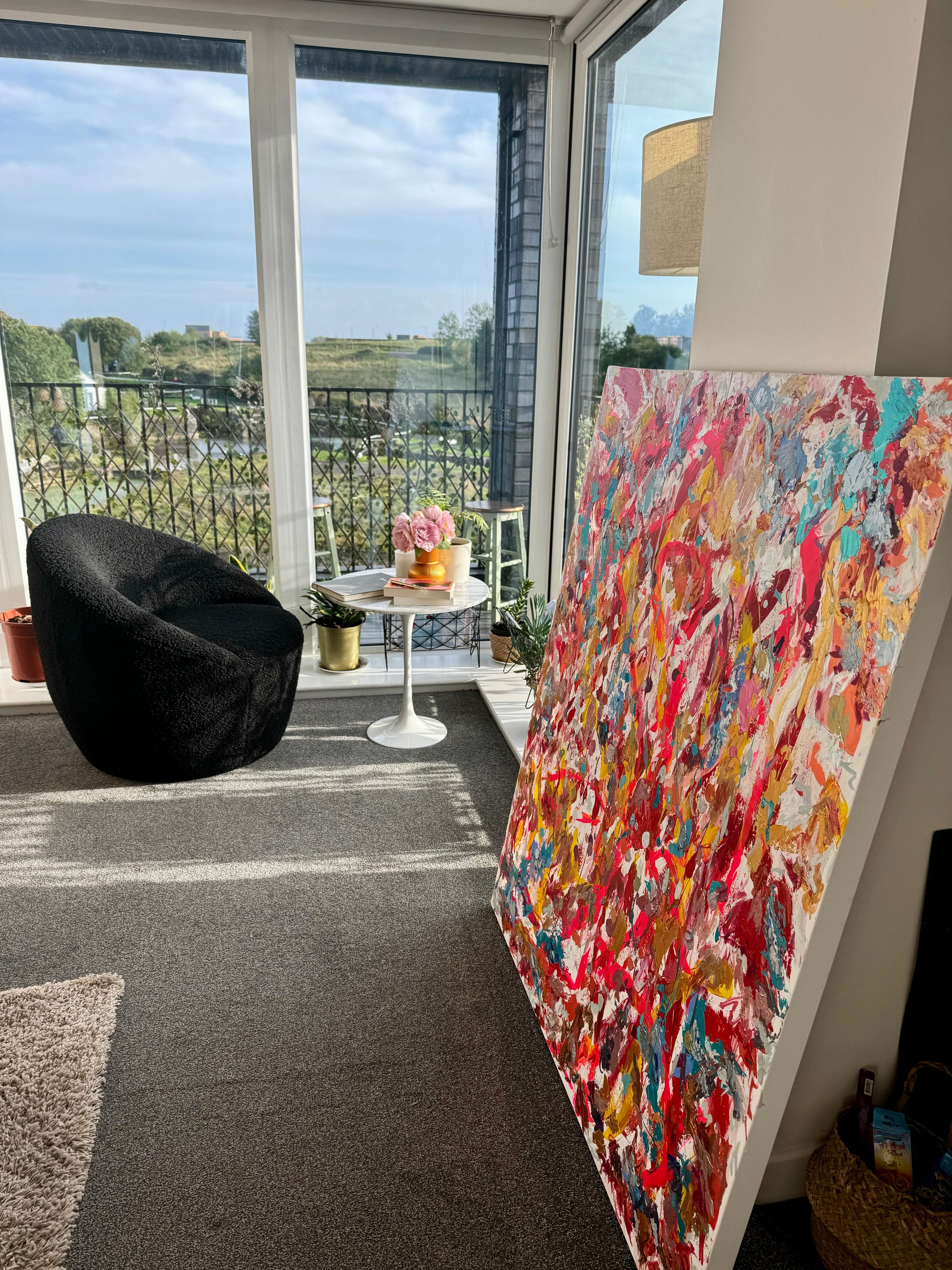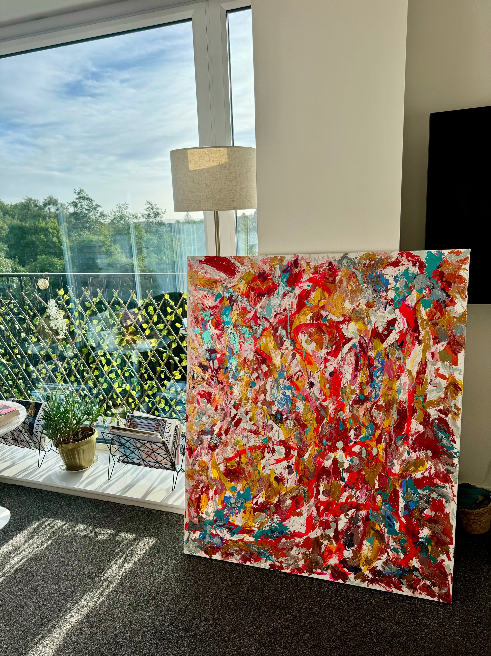 Mirage glistens with contrast and energy — a painting alive with shifting tones of crimson, gold, and turquoise. In the glow of the golden hour, its surface comes to life, radiating warmth and depth, pulling the viewer into its layered textures and changing light.